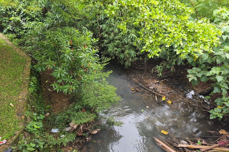 Kondisi kali Ciputat yang alirannya diduga beralih fungsi menjadi mal Bintaro Xchange tampak menghitam dan tak mengalir.