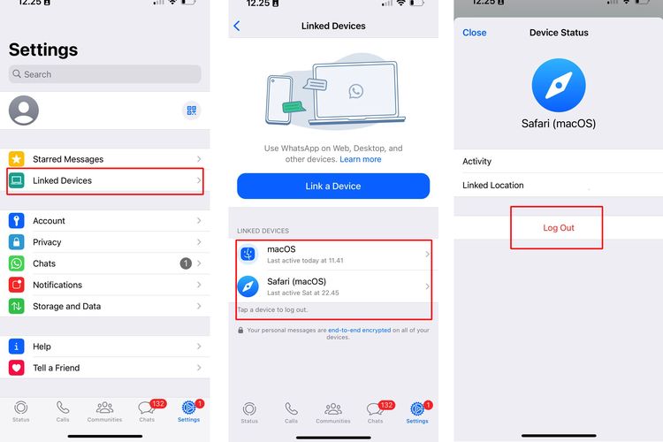 Pada menu itu,pengguna bakal disajikan daftar semua perangkat atau platform yang telah login menggunakan akun WhatsApp. Untuk mengeluarkan akun WhatsApp,klik salah satu perangkat dan pilih opsi “Log Out”.