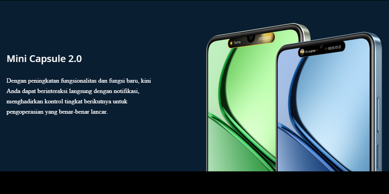 Realme Indonesia Realme C63 dilengkapi dengan fitur Mini Capsule 2.0.Redmi 13: layar IPS LCD 6,79 inci,resolusi Full HD Plus (2.460 x 1.080 piksel),refresh rate 90 Hz,brightness maksimum 550 nits,kerapatan piksel 396 ppi.Realme C63: layar LCD 6,74 inci,resolusi HD Plus,kecerahan puncak 560 nit,dan touch sampling rate 180 Hz.Baca juga: HP Realme C63 Resmi Meluncur di Indonesia,Ini HarganyaLayar ini punya poni mirip Dynamic Island iPhone. Poni tersebut didukung fitur Mini Capsule 2.0 yang akan memunculkan animasi ketika ada notifikasi.Chipset