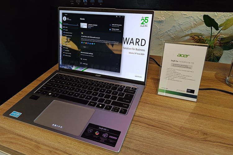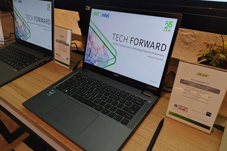 KOMPAS.com/BILL CLINTEN Dalam rangka merayakan hari jadinya yang ke-25,produsen komputer Acer menggelar acara bertajuk Tech Forward di bilangan Menteng,Jakarta Pusat pada Rabu (5/6/2024). Acara ini dihelat untuk melihat rangkaian produk dan solusi Acer yang mampu menjalankan berbagai aplikasi dan pemrosesan kecerdasan buatan (AI),terutama untuk segmen bisnis. Salah satu yang dipamerkan adalah Acer Travelmate P414