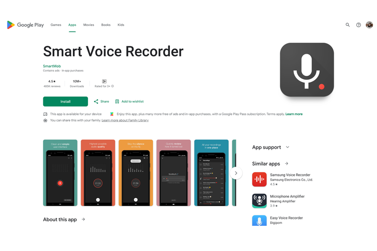 Aplikasi Smart Voice Recorder kompatibel dengan Android dan merupakan perekam suara tingkat menengah yang dilengkapi dengan fitur pengeditan. Aplikasi ini dianggap sebagai salah satu yang terbaik untuk sulih suara berkat antarmuka penggunanya yang ramah bagi pemula.