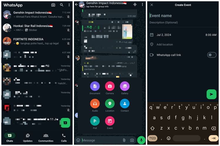Pantauan KompasTekno pada Senin (1/7/2024) pagi,kami sudah bisa menemui menu "Event" di dalam sebuah Group Chat.