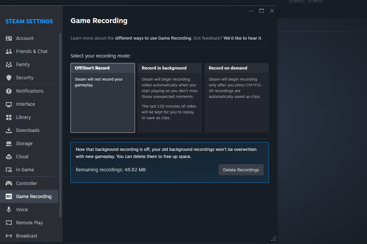 Steam Game Recording menawarkan dua mode perekaman video yang bisa digunakan,yakni "Record in background" dan "Record on demand".