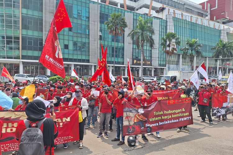 Sebagai informasi,sejumlah kurir J&T melakukan aksi unjuk rasa di depan kantor PT Global Bintang Timur Ekspress sejak pukul 10.00 WIB.