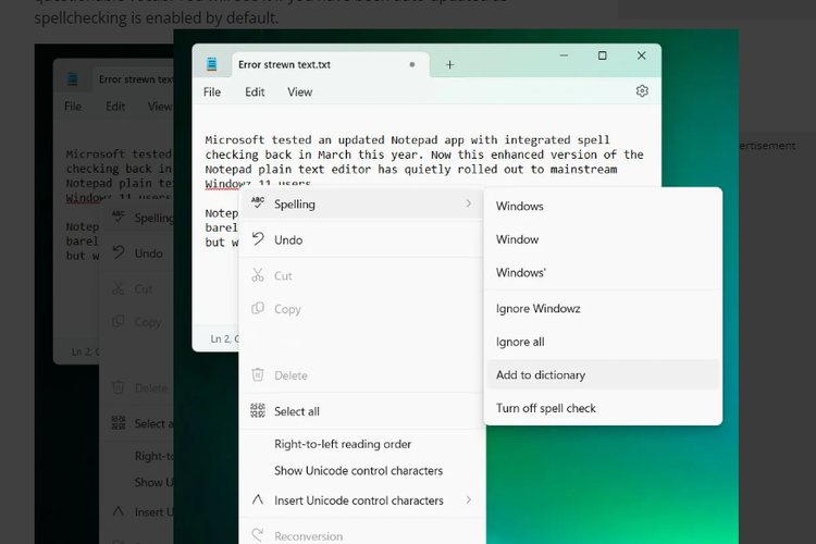 Toms Hardware Microsoft merilis fitur untuk mengecek ejaan atau kata yang salah di aplikasi Notepad Windows 11. Fitur sedarhana ini baru pertama kali hadir di Notepad sejak dirilis pada 1983.