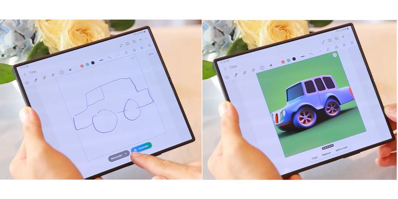KompasTekno mencobanya dengan menggambar mobil di aplikasi Galaxy Notes. Galaxy Z Fold 6 mengenali obyek tersebut sebagai mobil dan memberikan gambar hasil image generation yang sesuai. Pengguna pun bisa bebas memilih style gambar,misalnya kartun atau 3D.