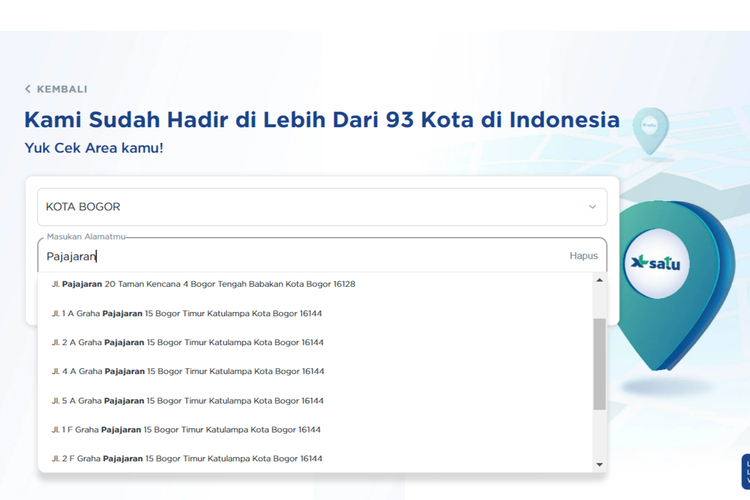 Saat ini,XL SATU telah menjangkau lebih dari 93 kota di Indonesia. Pengecekan ketersediaan jaringan di wilayah Anda,dapat dilakukan dengan mengakses tautan ini. Menariknya,jika kawasan Anda belum terlayani jaringan XL SATU,Anda dapat mengajukan perluasan jaringan.