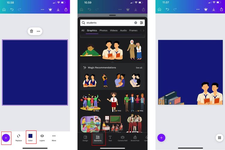 Caranya klik ikon tambah dan pilih menu “Elemen”. Cari dan pilih elemen yang bertemakan sekolah,misal bangunan sekolah,ilustrasi siswa,gambar buku,dan lainnya.
