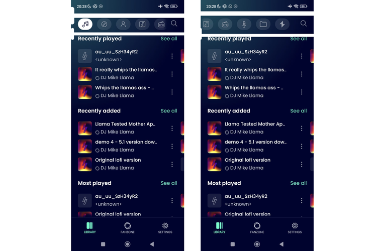 Pengguna juga bisa melihat bagian deretan fitur menu di atas yang ditandai dengan ikon-ikon tertentu. Dari kiri fitur pemutar musik reguler yang dapat dicek riwayat musik yang baru saja dimainkan atau ditambahkan.