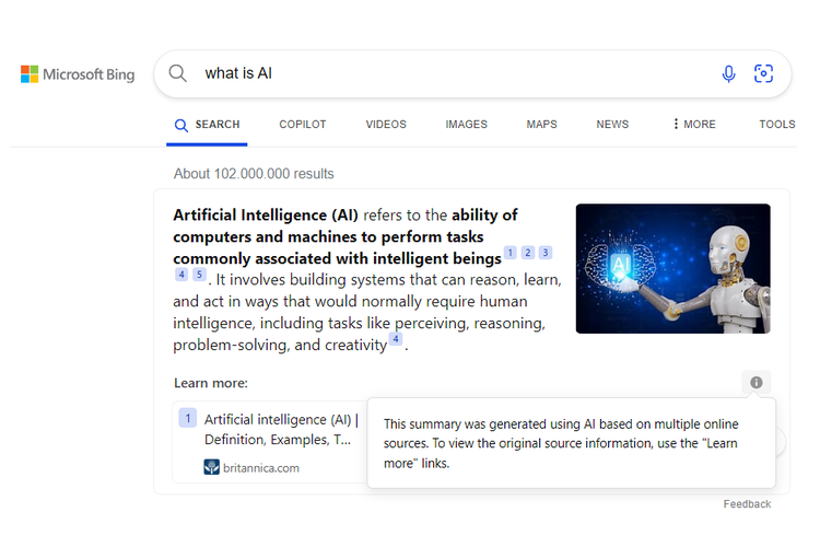 "Dalam prosesnya,AI akan meninjau sejumlah informasi yang didapat,serta mencocokkannya dengan informasi lainnya seputar topik yang dicari pengguna,sebelum dapat merangkum informasi tersebut. Dengan begitu,hasil pencarian akan semakin efektif," tambah Microsoft.