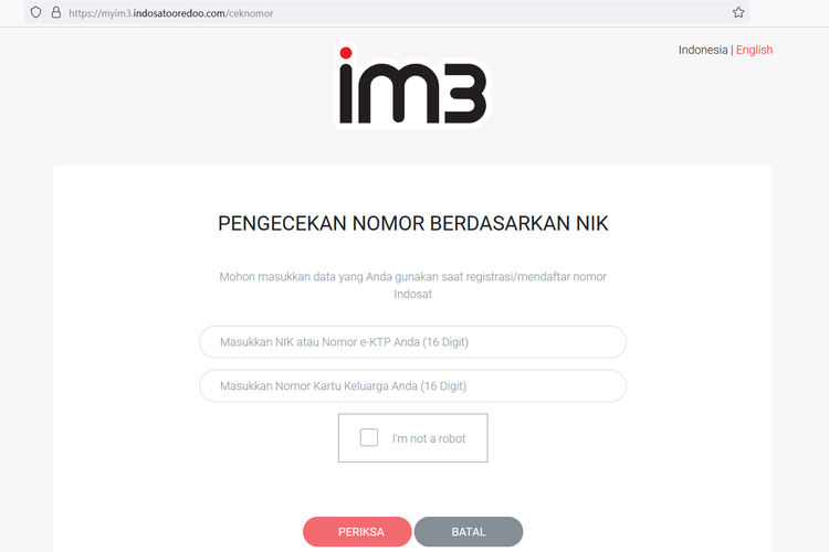 Pengecekan di website Indosat dapat dilakukan dengan memasukkan NIK (Nomor Induk Kependudukan) dan nomor KK (Kartu Keluarga) yang dipakai registrasi nomor dulu. Adapun cara cek nomor Indosat lewat website adalah sebagai berikut: