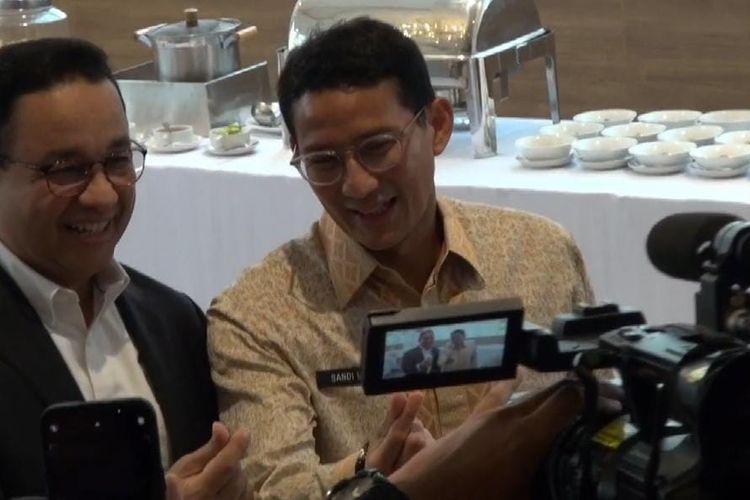 Anies dan Sandi tampak ceria ketika bertemu kembali.