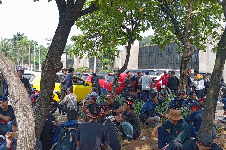 Berdasarkan pantauan Kompas.com,pada pukul 12.00 WIB,massa duduk santai di trotoar dan taman di depan Gedung DPR.
