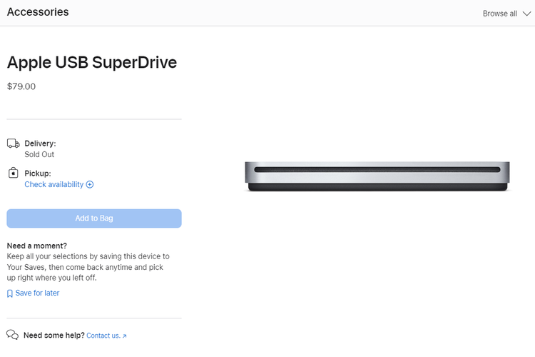 Memasuki 2024,atau sekitar 16 tahun dijual,aksesori tersebut akhirnya kini sudah ludes terjual. Pasalnya,laman penjualan Apple USB SuperDrive menampilkan status barang yang sudah habis alias "Sold Out".