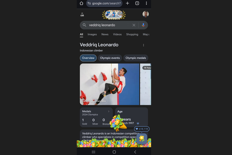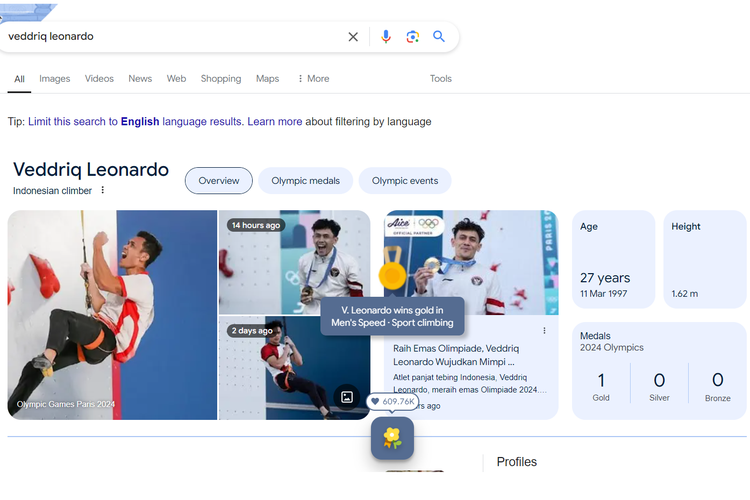 Di halaman pencarian Veddriq,teks yang muncul adalah "V. Leonardo wins gold in Men's Speed Sport Climbing" (V. Leonardo memenangkan medali emas di Panjat Tebing Cepat Putra).