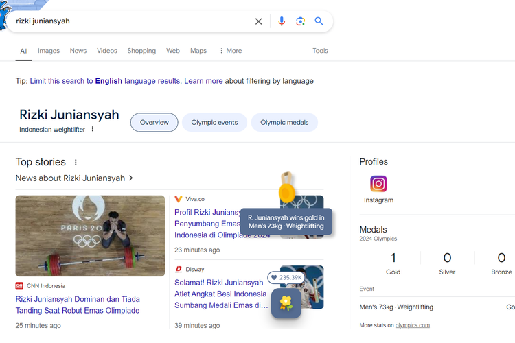 Nah,"medali emas" Google diberikan lewat mesin pencari (search engine) Google Search. Tentu saja bukan medali emas asli yang muncul,melainkan elemen serupa medali emas yang menyembul ketika menelusuri kata kunci "Veddriq Leonardo" atau "Rizki Juniansyah" di Google Search.