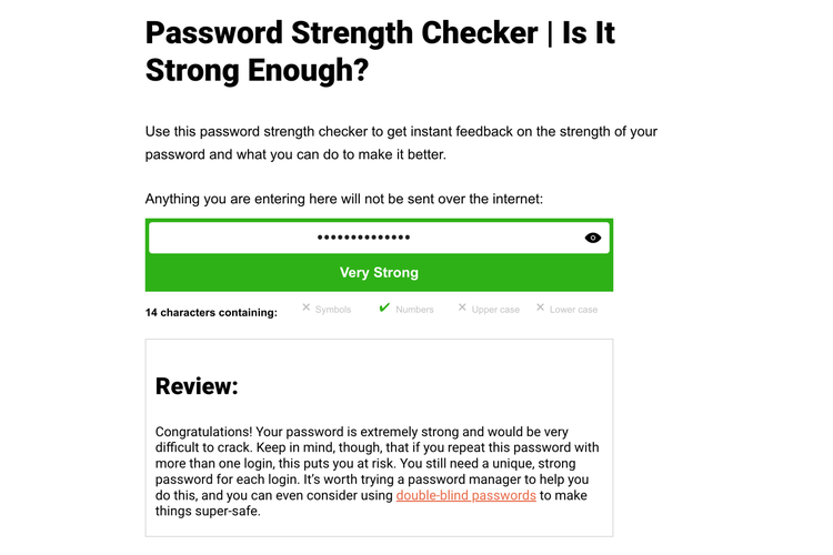 Maka dari itu Anda dapat mengecek ulang susunan password yang Anda gunakan melalui situs password checker atau pengecek kata sandi. Situs password checker ini membantu pengguna untuk mengecek kekuatan password.
