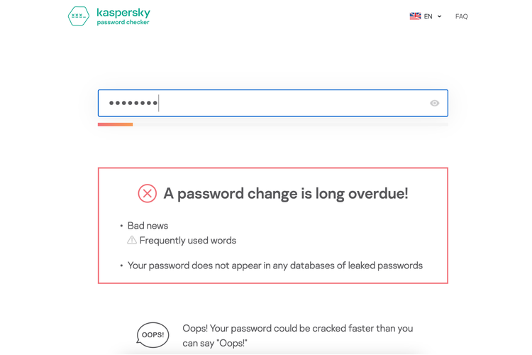 Situs Kaspersky merupakan website penguji atau pengukur kata sandi. Kaspersky sendiri merupakan perusahaan keamanan siber. Anda dapat memanfaatkan situs penguji kata sandi Anda. Bagi Anda yang penasaran,dapat mencobanya di situs password.kaspersky.com.