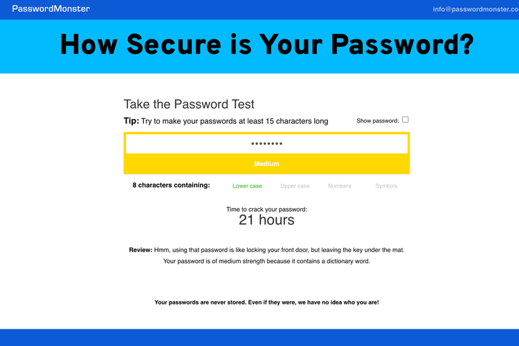 Saat Anda menggunakannya,nantinya Anda akan mendapatkan skor kekuatan dasar (lemah,sedang,kuat) dan perkiraan waktu yang dibutuhkan untuk memecahkan kata sandi Anda.