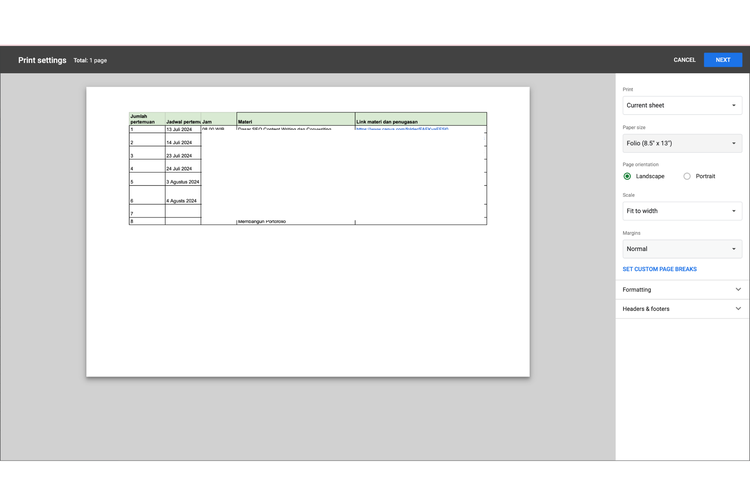 Cara atur print area di Google Sheets