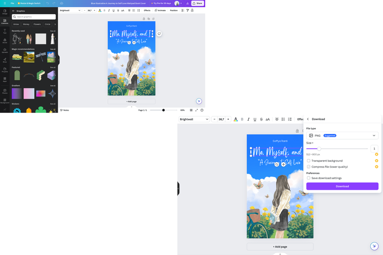 Setelah mengedit,Anda dapat menyimpan dan mengunduh desain cover novel atau buku yang sudah selesai dibuat
