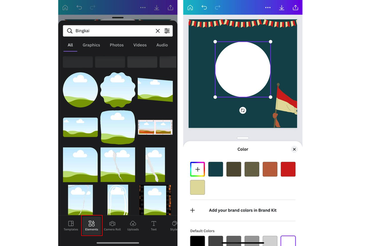 Bila background telah selesai dibuat dengan menambahkan beberapa elemen,silakan tambahkan bidang bingkai foto. Caranya,klik ikon tambah dan pilih opsi “Elemen”,lalu cari dan pilih bidang bingkai sesuai kebutuhan.