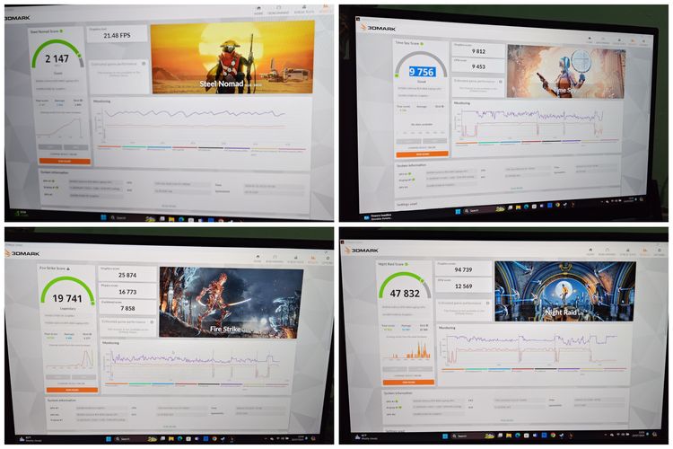 Pengujian ini mengandalkan beragam software benchmark populer gratis yang ada di internet,salah satunya adalah 3DMark. Di aplikasi ini,ada beberapa mode pengujian yang kami gunakan,yaitu meliputi Fire Strike,Steel Nomad,Time Spy,dan Night Raid.