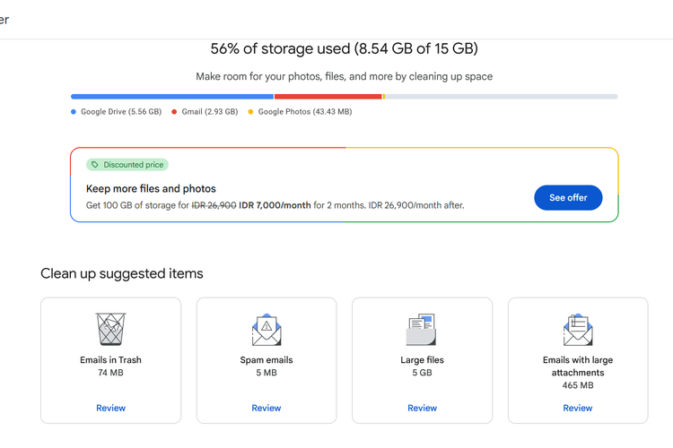 Selanjutnya,pengguna akan disajikan dengan beberapa rekomendasi untuk menghapus file atau data dalam kategori tertentu yang membuat penyimpanan penuh,seperti data e-mail yang terdapat di folder sampah,e-mail spam,foto di Google Photos,file di Google Drive yang berukuran besar,dan e-mail di Gmail dengan lampiran yang berukuran besar.