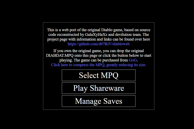 Menu "Select MPQ" digunakan untuk mengunggah (upload) file Diablo ke situs tersebut. Hal ini dilakukan karena proyek ini tidak mencakup file game Diablo. Jadi,pemain harus menyiapkan sendiri file Diablo bernama DIABDAT.MPQ.