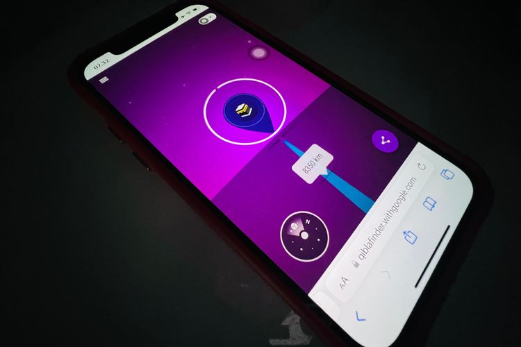 KOMPAS.com/Zulfikar Hardiansyah Ilustrasi cara menentuan arah kiblat online tanpa aplikasi dengan Qibla Finder.