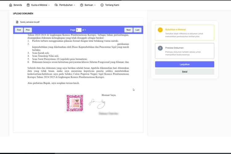 Jika e-meterai telah dibubuhkan dengan benar,klik opsi “Lanjutkan”.