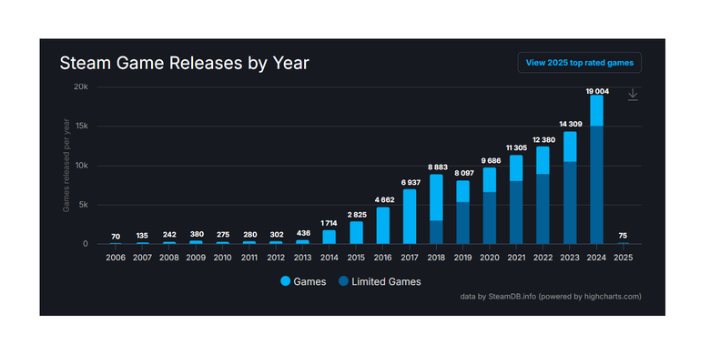 SteamDB Data SteamDB menunjukkan bahwa Steam merilis sebanyak 19.004 game pada 2024.