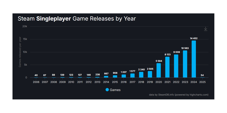 SteamDB Game singleplayer masih mendominasi perilisan game pada 2024,dengan jumlah mencapai 14.452 games.