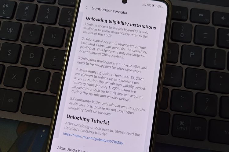 Kompas.com/LELY MAULIDA Tampilan kebijakan unlock bootloader terbaru di HP Xiaomi.