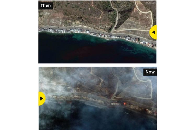 Maxar Technologies Citra satelit menunjukkan Pacific Coast Highway di sepanjang garis pantai Malibu,California pada tanggal 20 Oktober dan 8 Januari setelah kebakaran hutan yang dahsyat.