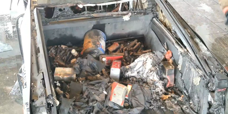 YouTube/Las Vegas Metropolitan Police Mobil Tesla Cybertruck yang meledak di depan Trump International Hotel,memuat tumpukan kembang api dan gas canister yang biasa digunakan untuk berkemah.