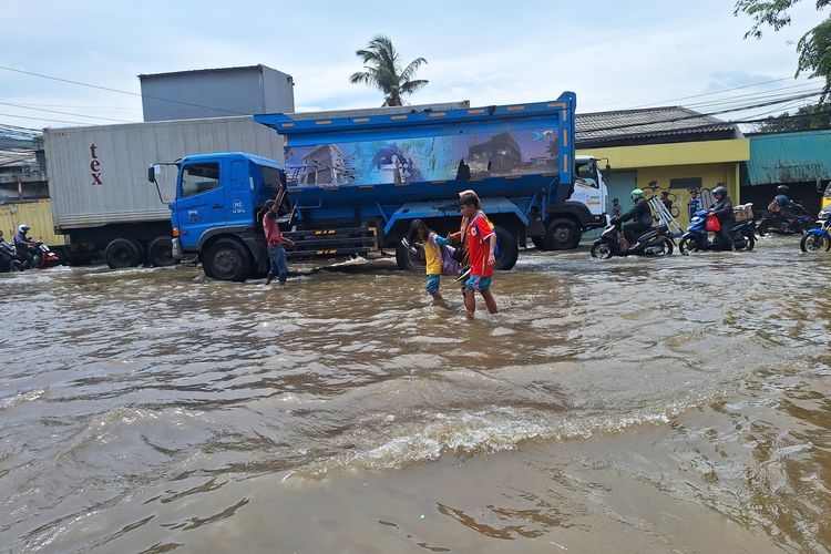 Ketinggian banjir mencapai 10 hingga 30 sentimeter yang menggenangi Jalan menuju Dermaga Kali Adem,Pelabuhan Muara Angke.