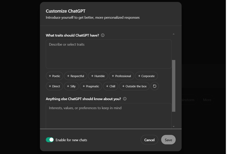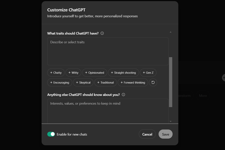 Nanti,pengguna akan melihat beberapa kolom,salah satunya "What traits should ChatGPT have". Menu ini memungkinkan pengguna untuk menentukan sifat yang diinginkan dari ChatGPT sesuai dengan kebutuhan mereka.
