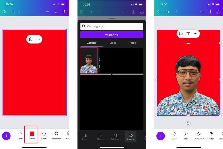 Setelah latar belakangnya jadi berwarna merah,silakan klik ikon tambah dan pilih menu “Unggahan”. Kemudian,unggah pasfoto tanpa background yang tadi telah dibuat di Background Eraser dan disimpan ke galeri HP.