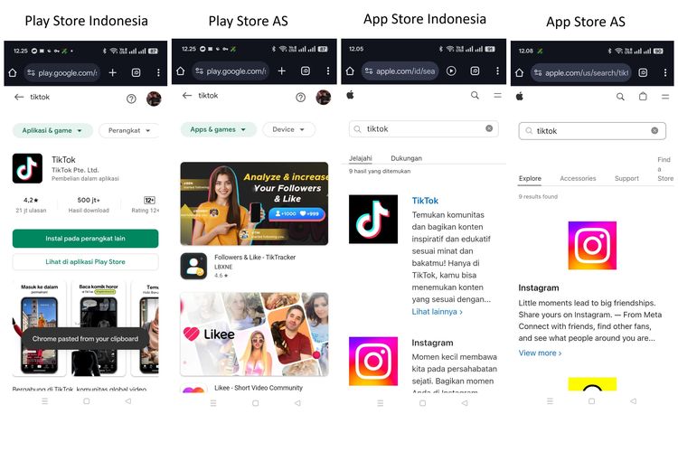 Kompas.com/BILL CLINTEN Ilustrasi aplikasi TikTok di Play Store dan App Store versi Indonesia dan AS.