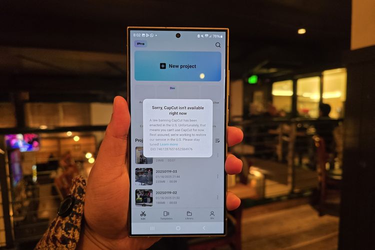 KOMPAS.com/ Galuh Putri Riyanto Isi pesan ketika pengguna membuka aplikasi CapCut di Amerika Serikat. Saat ini,akses aplikasi CapCut belum pulih,berbeda dengan TikTok.