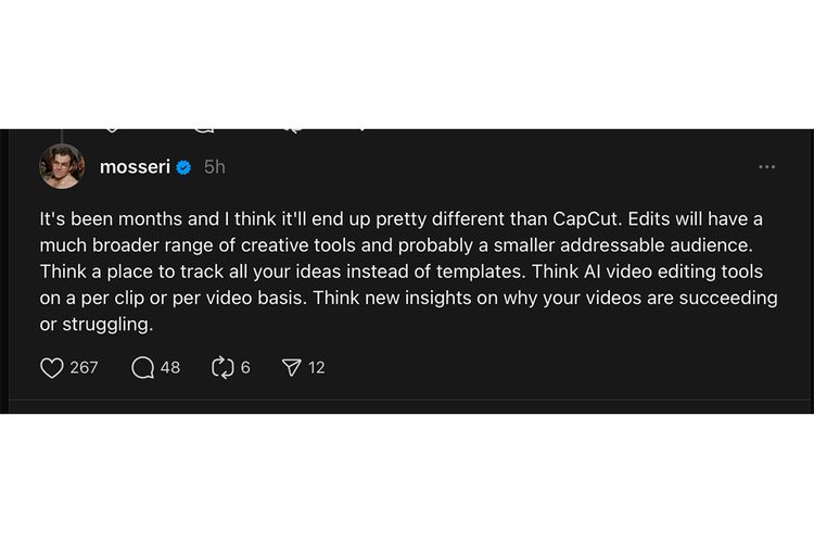 “Saya pikir itu akan berbeda dari CapCut. Edits sebagai alat edit memiliki jangkauan yang jauh lebih luas,(bahkan) audiens yang sulit dijangkau sekalipun. Pikirkan sebuah tempat untuk melacak seluruh ide Anda ketimbang dengan template,” tegas Mosseri.