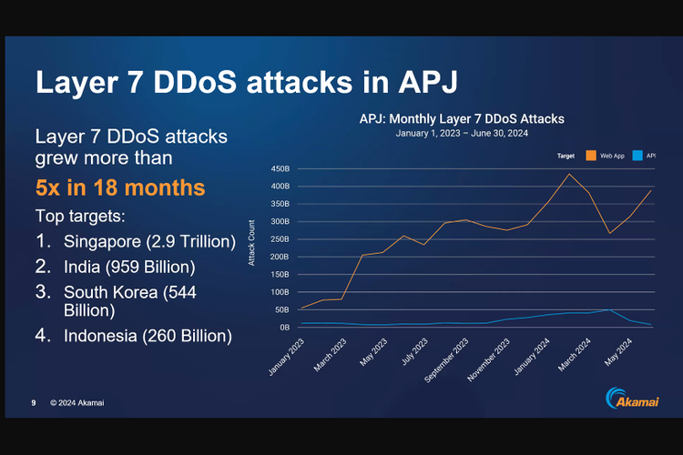 "Indonesia mendapatkan bagian cukup besar dari serangan DDoS layer 7,yang menyerang organisasi-organisasi di Indonesia," kata Reuben Koh,Director,Security Technology & Strategy Akamai dalam diskusi daring bersama media yang digelar Jumat (24/1/2025).