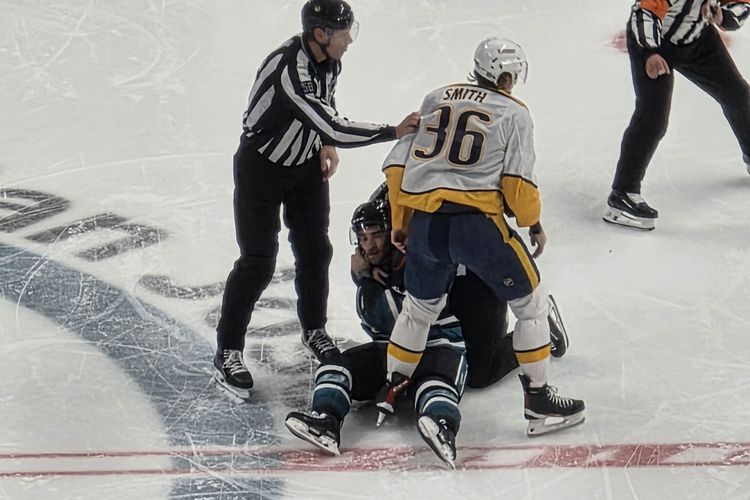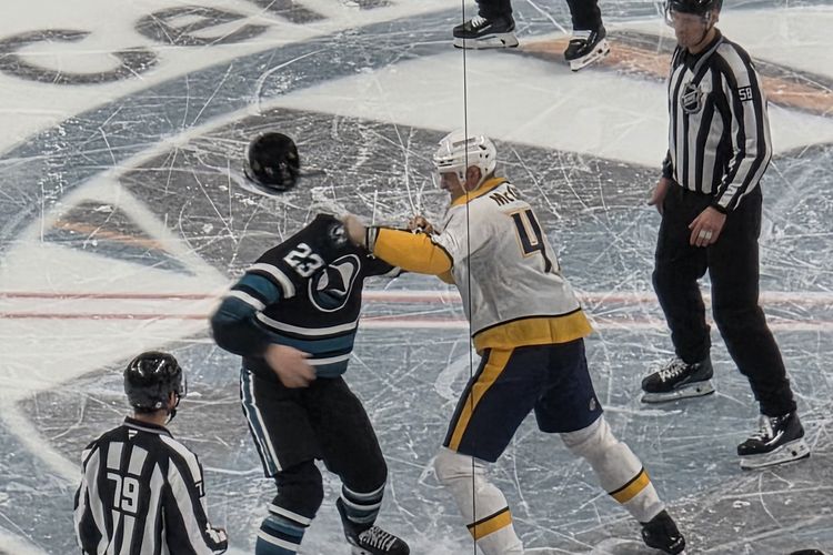 KOMPAS.com/ Galuh Putri Riyanto Detail yang ditangkap oleh kamera telefoto Samsung S25 Ultra memperlihatkan wajah pemain dan wasit setelah gelut. Foto ini kami ambil dari bangku tribun paling atas stadium SAP Center,San Joser,California di pertandingan Hoki antara San Jose Sharks vs Nashville Predators.