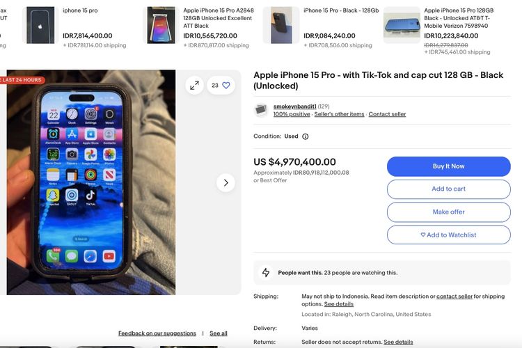 Misalnya pengguna eBay dengan akun dontosv0 yang memasang iklan "iPhone 15 Pro Max with TikTok",ditawarkan dengan harga 10.000 dollar AS,alias sekitar Rp 162 juta.