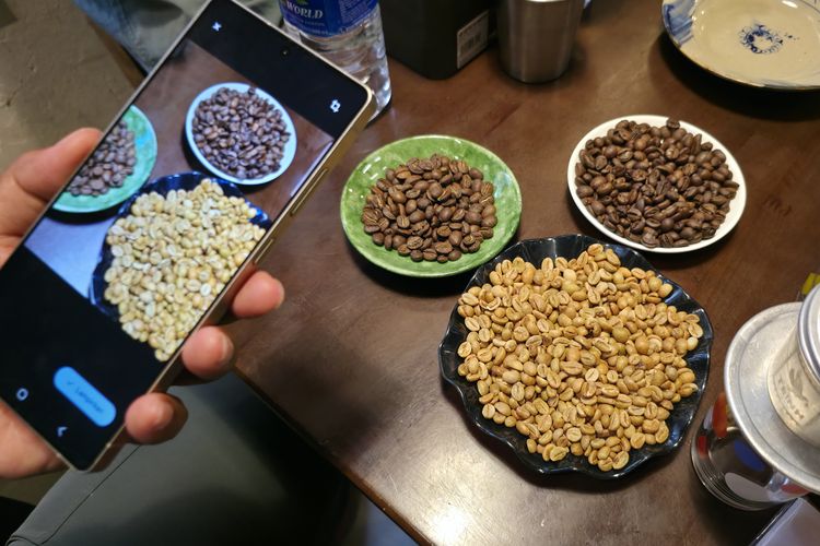 KOMPAS.com/GLORI K WADRIANTO Ada tiga jenis biji kopi yang diletakkan di atas piring,untuk kemudian dipotret dan ditanyakan melalui fitur Gemini Live di Samsung S25 Series,saat acara kelas kopi Vietnam di kafe Trinh di Kota Da Nang,pekan lalu. Gemini Live mampu mengidentifikasi jenis biji biji kopi tersebut dan lalu memberikan keterangan lengkap terkait obyek tersebut.