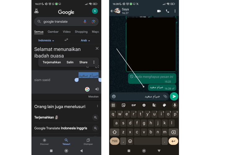 Salin hasil terjemahan dan gunakan untuk membuat stiker,atau pesan khusus Ramadhan.