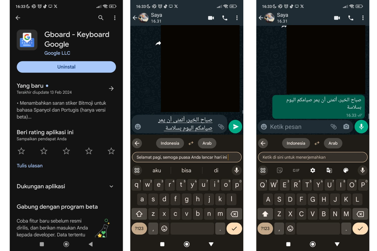 Ketik teks dalam bahasa Indonesia,dan Gboard akan otomatis menerjemahkannya ke bahasa Arab di kolom chat.