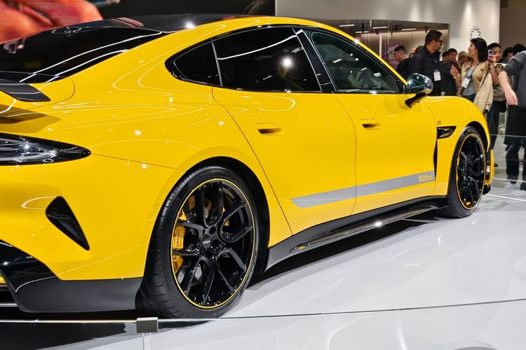 Xiaomi SU7 Ultra memiliki warna kuning menyala. Terdapat aksen garis berwarna abu-abu di sisi kanan dan kiri mobil,tepat di bagian bawah pintu.