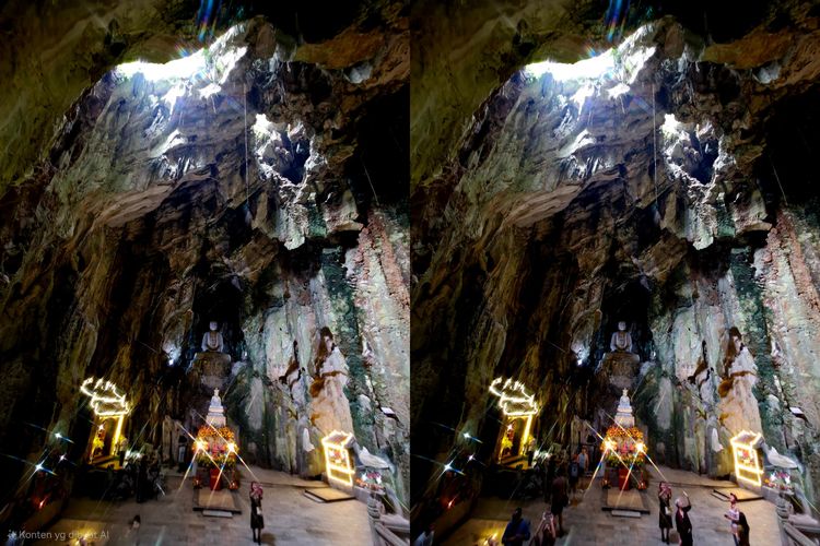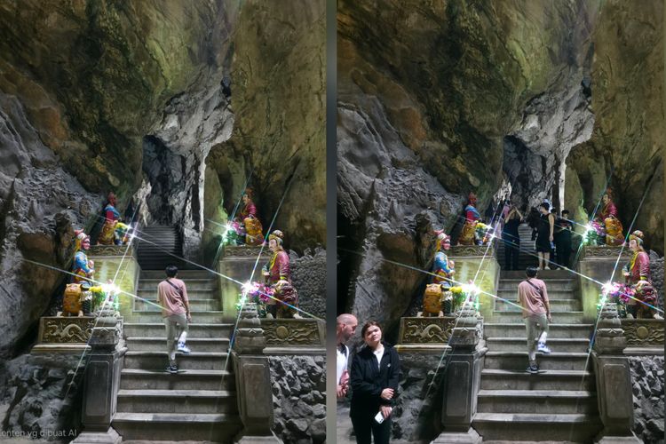 KOMPAS.com/GLORI K WADRIANTO Pemandangan di dalam Goa Huyen Khong di bukit Thuy Son,salah satu dari lima bukit di Marble Mountains,Vietnam. Foto (kanan) adalah foto asli di mana terdapat banyak pengunjung lain. Foto (kiri) adalah foto hasil editing menggunakan fitur object eraser pada Samsung S25 Ultra.